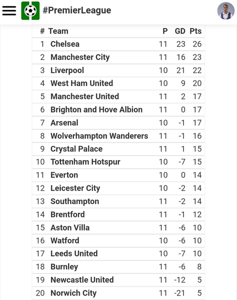 Chelsea | 38 | 43 | 74 |